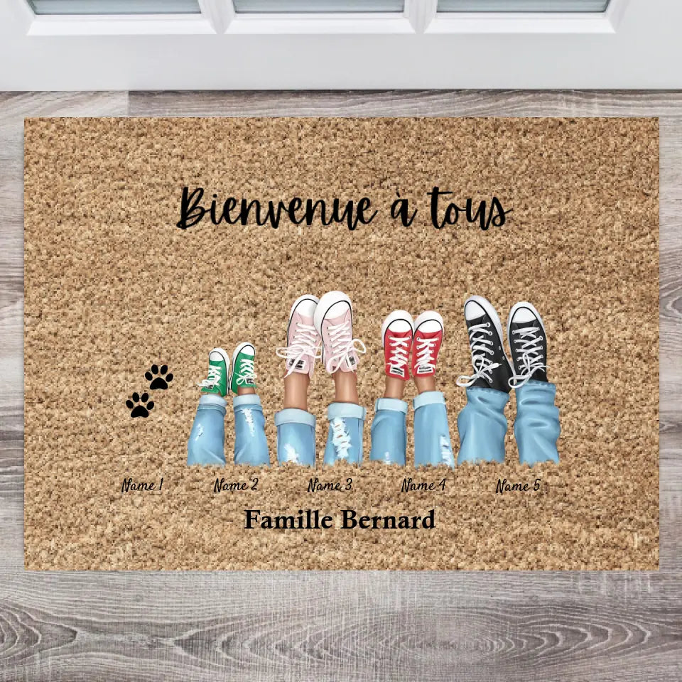 Bienvenue dans notre famille - Paillasson familial personnalisé (2-8 personnes, enfants & animaux)